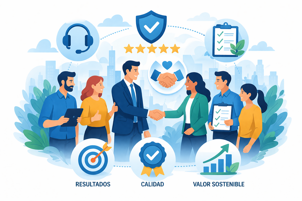 Nuestro principal compromiso es la satisfacción del cliente, a través de la entrega consistente de soluciones de calidad, orientadas a resultados y con un enfoque en la generación de valor sostenible. Fomentamos relaciones de largo plazo basadas en la confianza, la responsabilidad y el entendimiento profundo de las necesidades de cada organización.